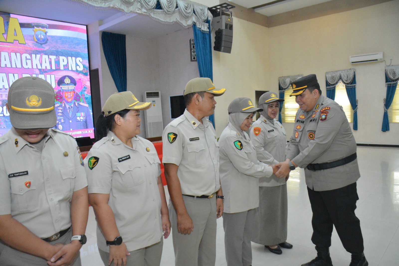 Ket Foto : Karo SDM Polda Kepri, Kombes. Pol. Dr. Irvan Prawira Satyaputra, S.I.K., M.Si memberikan ucapan selamat kepada personel PNS Polda Kepri yang naik pangkat