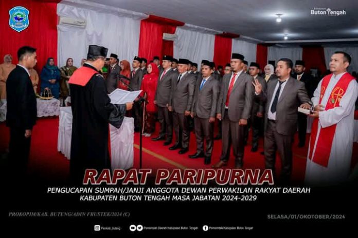 Bursakota.co.id, Buton Tengah – 25 Anggota Dewan Perwakilan Rakyat Daerah (DPRD) Kabupaten Buton Tengah (Buteng), Provinsi Sulawesi Tenggara, Periode 2024-2029 resmi dilantik berlangsung di Aula Rapat Kantor DPRD di Lakudo pada Selasa 1 Oktober 2024.