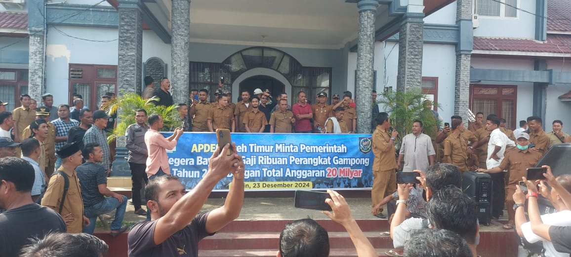“Kabupaten Aceh Timur sedang kekurangan transfer anggaran dari Pemerintah Pusat, oleh karena itu pihak Pemkab Aceh Timur tidak bisa membayarkan jerih payah 4.617 perangkat desa di Aceh Timur, jadi Pemkab Aceh Timur akan membuat Perbup terkait tunda bayar Siltap perangkat desa,” ujarnya kepada peserta aksi.