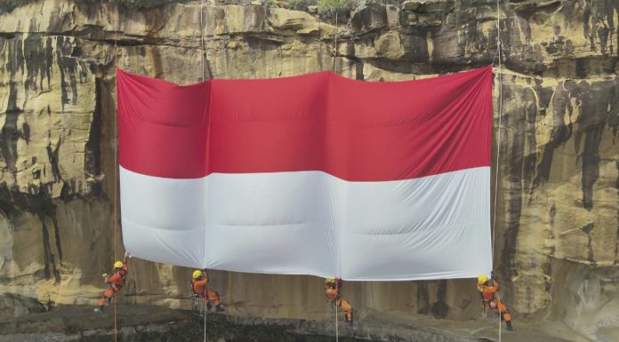 Natuna – Semangat kemerdekaan berkobar di ujung utara Indonesia saat Kantor Pencarian dan Pertolongan (Basarnas) Natuna sukses mengibarkan Bendera Merah Putih terbesar di Tebing Tanjung Datuk, Teluk Buton, Kecamatan Bunguran Utara.