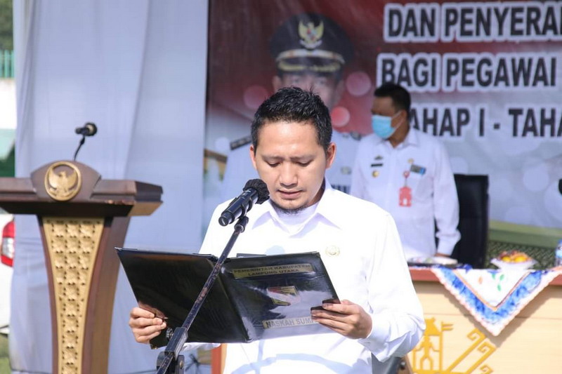 Wakil Bupati Lampung Utara Ardian Saputra, membacakan pengantar sumpah dilanjutkan dengan pembacaan sumpah, diikuti oleh seluruh PPPK Lampura anggaran tahun 2021.