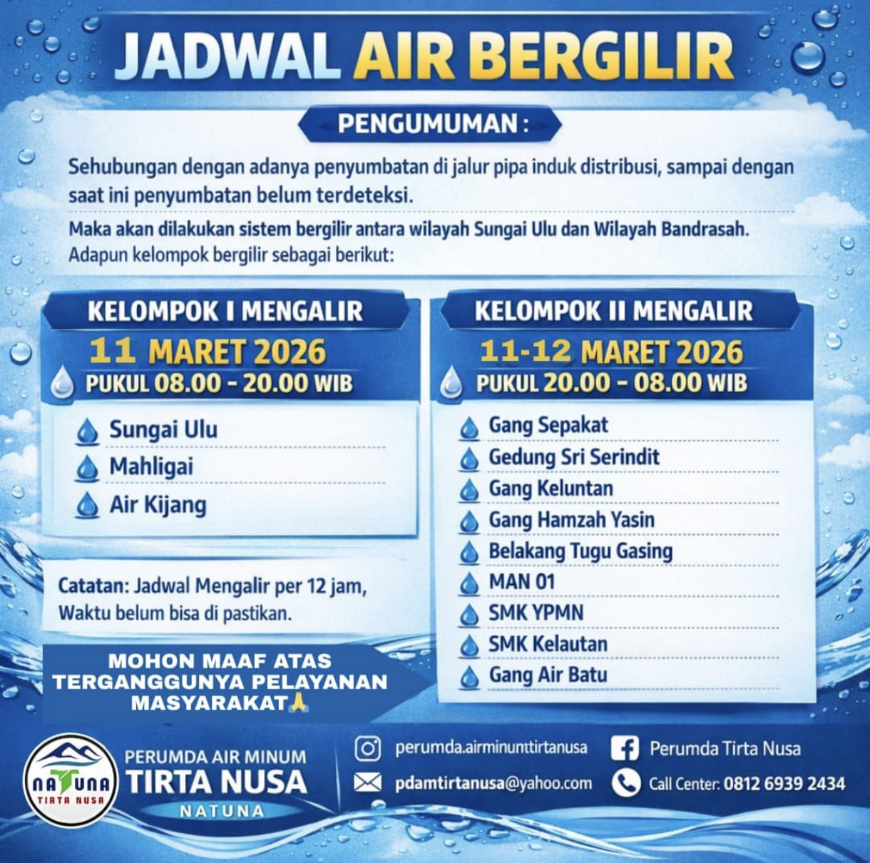Sementara Kelompok II akan mendapatkan giliran aliran air pada 11–12 Maret 2026 pukul 20.00 hingga 08.00 WIB, meliputi wilayah Gang Sepakat, Gedung Sri Serindit, Gang Keluntan, Gang Hamzah Yasin, Belakang Tugu Gasing, MAN 01, SMK YPMN, SMK Kelautan, dan Gang Air Batu.