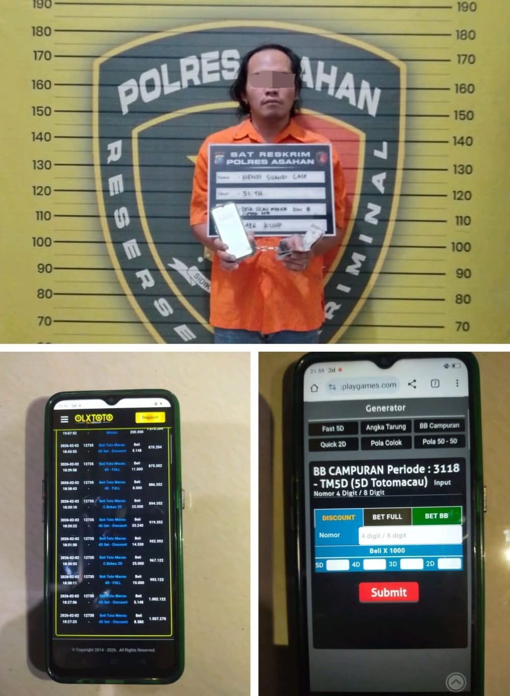 Dikonfirmasi, kapolres Asahan, AKBP Revi Nurvelani melalui Kasatreskrim AKP Immanuel Simamora kepada awak media, Rabu (4/2/2026) menjelaskan bahwa penangkapan pelaku berawal dari laporan masyarakat terkait aktivitas judi togel di lokasi tersebut.