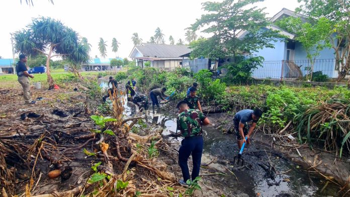 Personel Lanud RSA melaksanakan kegiatan bersih-bersih dengan membersihkan aliran sungai hingga ke garis pantai di kawasan Jalan Adi Sucipto, Komplek Fokker dan Dakota, Kabupaten Natuna, Provinsi Kepulauan Riau, Jumat (30/1/2026).