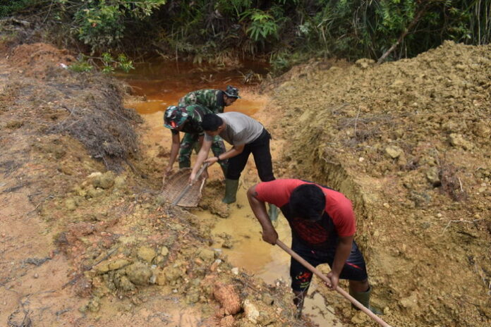 Anggota Satgas TMMD Kodim 0315/Bintan dan Warga Marok Tua Mulai Bangun Gorong-gorong Sebagai Penunjang Pembangunan Jalan