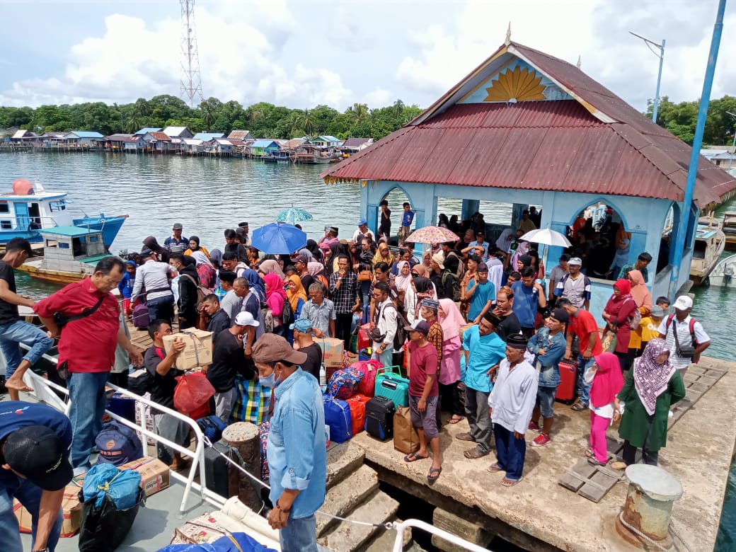 Ket Foto : Tampak penumpang memadati pelabuhan Desa Rejai, Lingga untuk melakukan perjalan balik ke Tanjungpinang