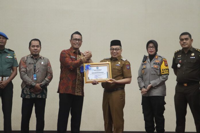 Di penghujung acara, Pj. Wali Kota Payakumbuh secara simbolis terima langsung kedua penghargaan dari BNNP Sumbar yang turut didampingi semua unsur Forkopimda serta dihadiri seluruh kepala OPD, camat, lurah serta tokoh masyarakat Kota Payakumbuh. (Warman/Humas)