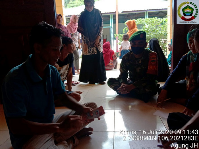 Bursakota, Anambas – Babinsa Koramil 02/Tarempa Serda Agung melaksanakan pendampingan penyaluran BLT dari Kemensos di desa Kiabu Kecamatan Siantan Selatan Kabupaten Kepulauan Anambas (KKA), Kamis (16/07).