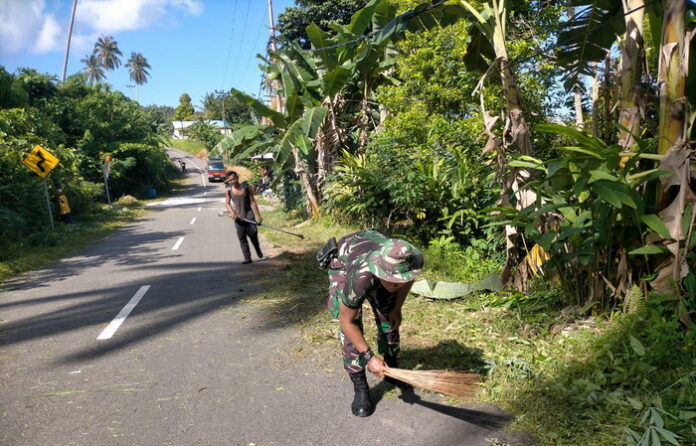 Bursakota.co.id, Anambas – Bintara Pembina Desa (Babinsa) Koramil 02/Tarempa Praka Indra Lesmana melaksanakan gotong royong bersama warga binaan di Desa Tiangau Kecamatan Siantan Selatan Kabupaten Kepulauan Anambas (KKA), Selasa 15 Juni 2021.