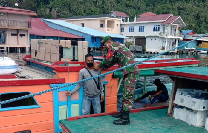 Bursakota, Tarempa – Bintara Pembina Desa (Babinsa), Koramil 02/ Tarempa Kodim 0318/Natuna Serda Bambang dan Serda Agung melaksanakan kegiatan komunikasi sosial (Komsos) kepada ABK kapal yang masuk dan pergi dari pelabuhan Tarempa sekaligus penegakan disiplin protokol kesehatan guna mencegah penyebaran Virus Corona atau Covid – 19 di wilayah binaan Koramil 02/ Tarempa.