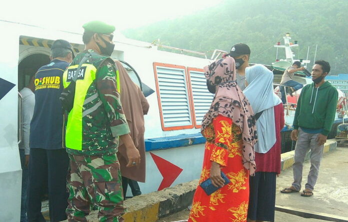 Bursakota.co.id, Anambas – Bintara Pembina Desa (Babinsa) Koramil 02/Tarempa Sertu Syaiful Bahri dan Kopda Pardenande S bersama Tim Satgas Covid-19 KKA melaksanakan pengamanan dan pengawasan serta penerapan protokol kesehatan terhadap penumpang kapal cepat MV. VOC Batavia tujuan Tanjung Pinang dari pelabuhan Tarempa KKA, Minggu (25/04/2021).