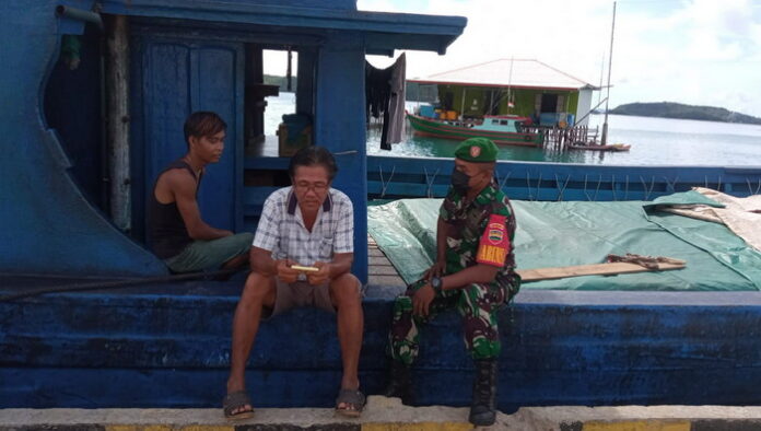 Bursakota.co.id, Anambas – Babinsa Koramil 07/Palmatak Kodim 0318/Natuna, Kopral Dua (Kopda) Hafit Heriadi melaksanakan kegiatan rutin yaitu Komunikasi Sosial (Komsos) dengan Anak Buah Kapal (ABK) muatan di Desa Ladan, Kecamatan Palmatak, Sabtu (09/04/2022).