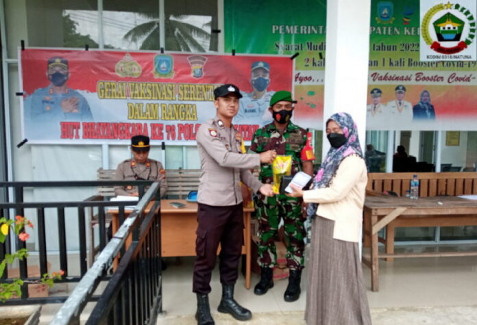 Bursakota.co.id, Anambas – Babinsa Koramil 07/Palmatak Kodim 0318/Natuna, Sersan Dua (Serda) ferry Susanto melaksanakan kegiatan pengamanan (Pam) di gerai Vaksinasi UPT Puskesmas Palmatak, Jumat (17/6/2022).