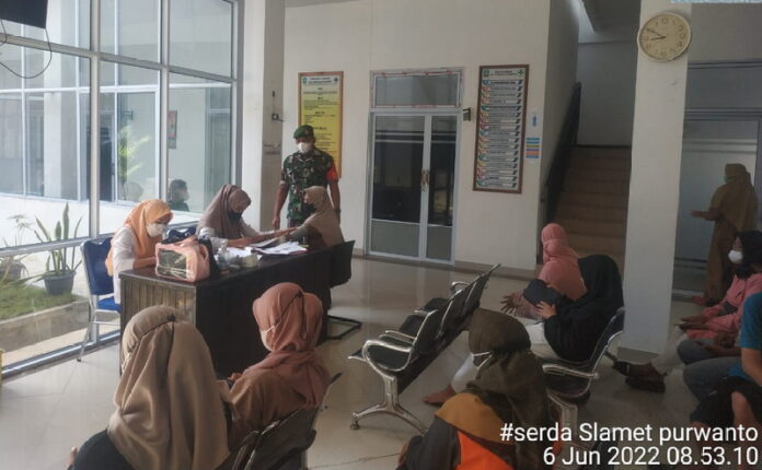 Bursakota.co.id, Anambas – Babinsa Koramil 07/Palmatak Kodim 0318/Natuna, Sersan Dua (Serda) Selamet Purwanto dan Serda Junius Souhali melaksanakan kegiatan pengamanan di gerai Vaksinasi UPT Puskesmas Palmatak, Senin (6/6/2022).