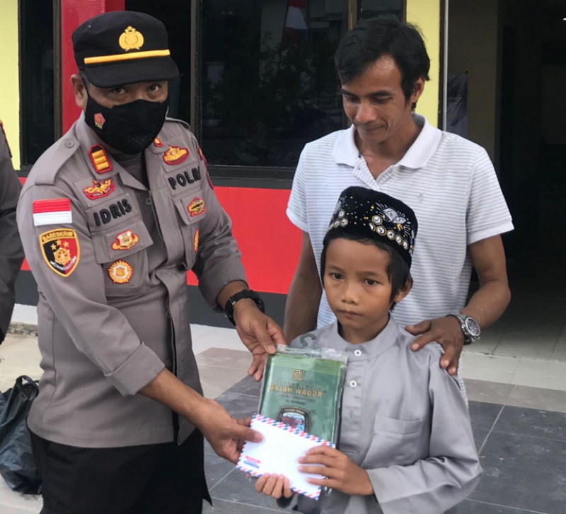 Juga dilakukan Penyerahan Kain Sarung dan Peci serta Uang saguhati kepada anak-anak yang dikhitan. Oleh Kapolsek Daik Lingga AKP Idris, S.E., Sy., M.H.