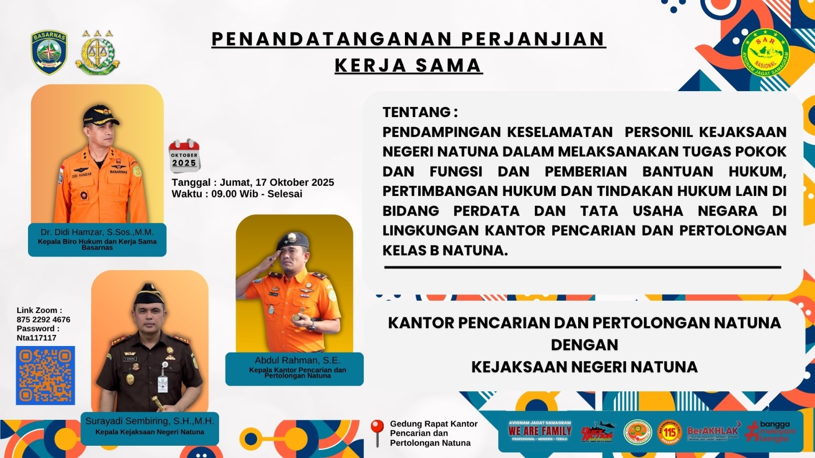 Penandatanganan MoU ini rencananya akan dilaksanakan secara daring dan luring terbatas, dengan dihadiri oleh Dr. Didi Hamzar, S.Sos., M.M. selaku Kepala Biro Hukum dan Kerja Sama Basarnas; Abdul Rahman, S.E., Kepala Kantor Pencarian dan Pertolongan Natuna; serta Surayadi Sembiring, S.H., M.H., Kepala Kejaksaan Negeri Natuna.