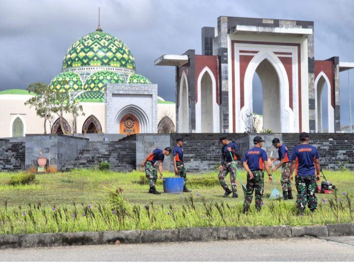 Dalam kegiatan ini, para prajurit bahu-membahu melakukan berbagai pekerjaan seperti pemotongan rumput, pembersihan taman, dan penataan lingkungan di sekitar area masjid.