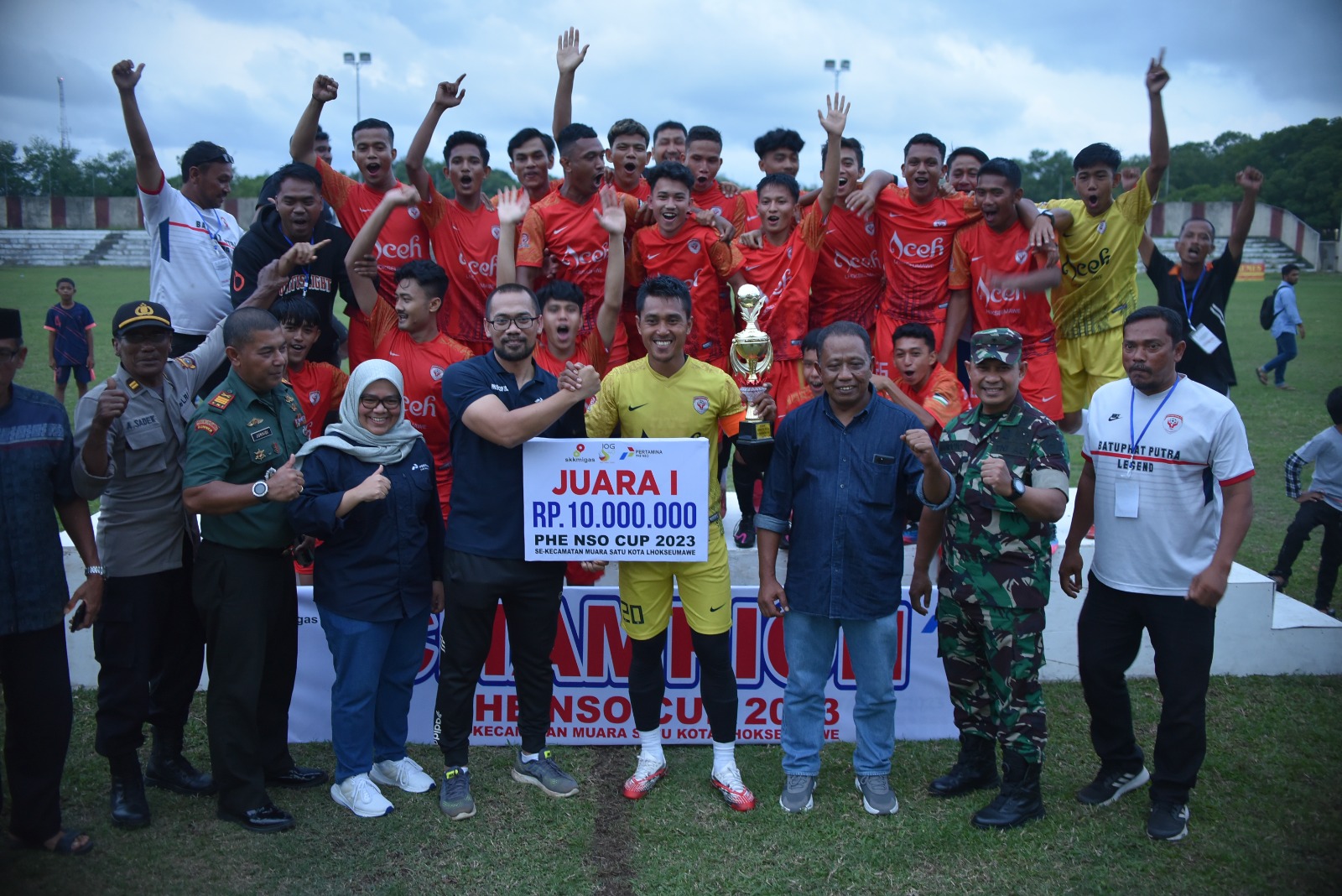 Penutupan turnamen PHE Cup 2023 turut dihadiri, Muspika Muara Satu, Manajemen Pertamina PHE NSO, Forum Geuchik, Forum Ketua Pemuda, dan para suporter pendukung kedua belah tim sepak bola. (Bk/Dedy)