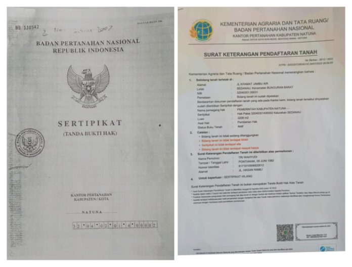 Bursakota.co.id, Natuna – Telah tercecer sebuah surat Sertifikat atas nama Pemkab Natuna disekitaran wilayah Kecamatan Bunguran Barat, Kabupaten Natuna, Provinsi Kepri.