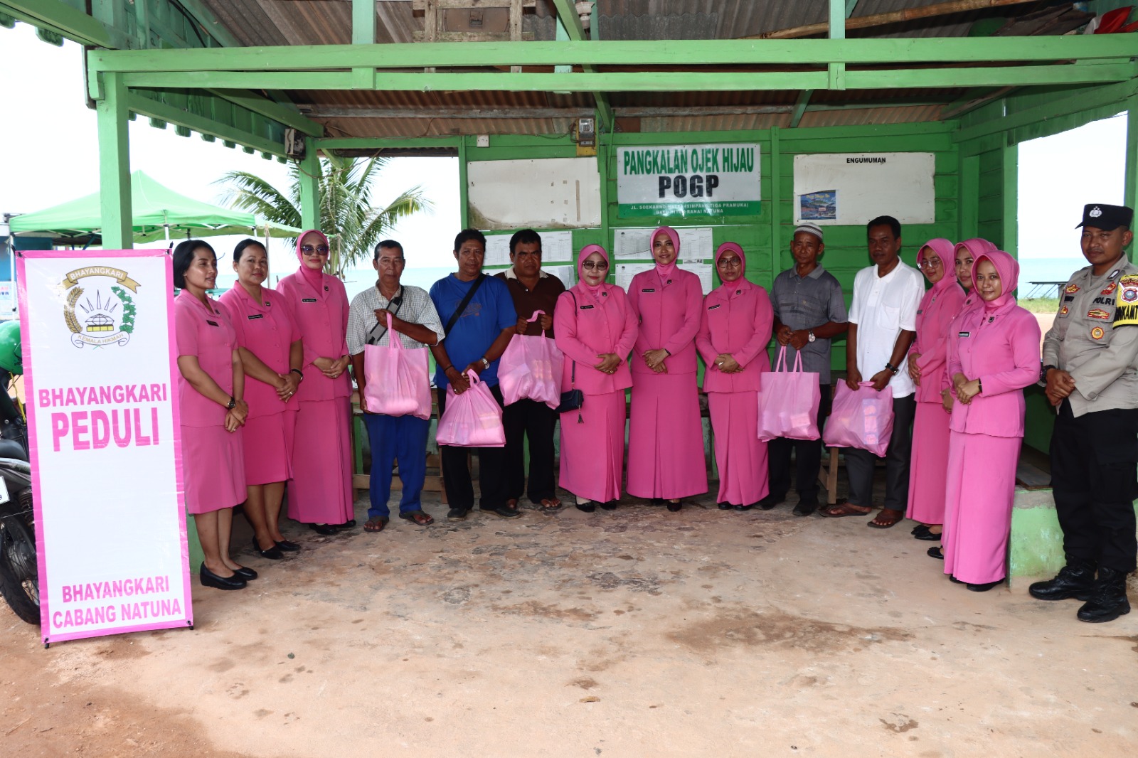 Bursakota.co.id, Natuna – Ketua Bhayangkari Cabang Natuna Ny. Citra Nanang dan Pengurus Bhayangkari sambangi Pangakalan Ojek Hijau di Kelurahan Ranai memberikan bantuan sembako, Kamis (14/09/2023).