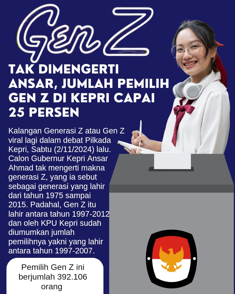 Kebenyakan Gen Z merupakan pemilih pemula dalam Pilgub Kepri kali ini. Menurut KPU, pemilih Gen Z ini berjumlah 392.106 orang atau mencapai 25 persen dari keseluruhan jumlah pemilih Kepri yang mencapai 1.559.727 orang.