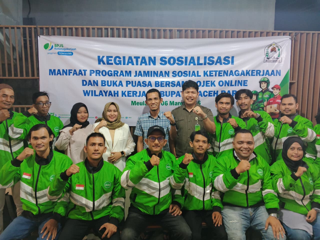 Meulaboh – BPJS Ketenagakerjaan Cabang Meulaboh menggelar sosialisasi program jaminan sosial ketenagakerjaan kepada pengemudi Draiv Ojek Online Meulaboh, Jumat (6/3). Kegiatan ini dirangkaikan dengan buka puasa bersama sebagai bentuk kepedulian terhadap pekerja sektor informal. Kegiatan dihadiri oleh pengemudi Draiv Ojek Online Meulaboh beserta tim BPJS Ketenagakerjaan Cabang Meulaboh. Para pengemudi mendapatkan pemahaman mengenai pentingnya perlindungan kerja, khususnya bagi pekerja dengan mobilitas tinggi di jalan.