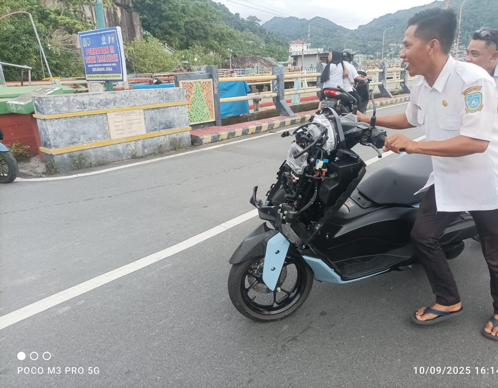 FOTO : Warga mengevakuasi sepeda motor yang rusak parah setelah menabrak trotoar di sekitar jembatan SP II.Rabu (10/09/2025).