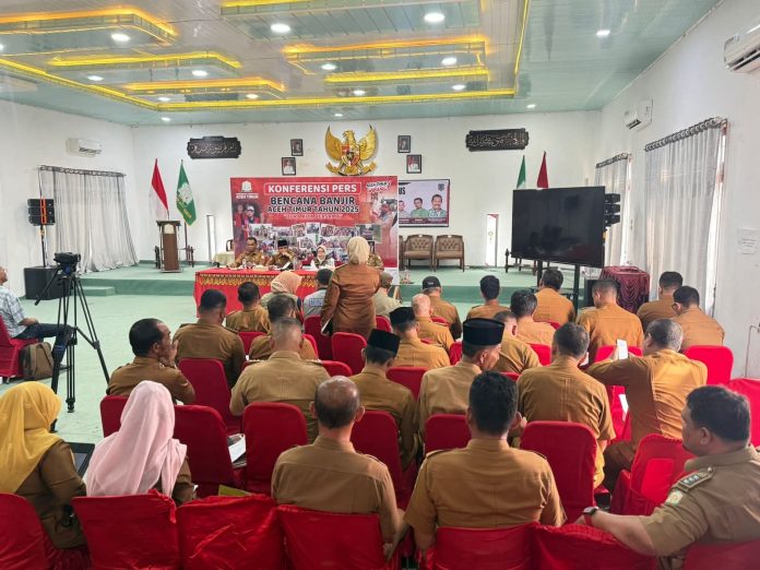 Rapat tersebut turut dihadiri oleh Badan Nasional Penanggulangan Bencana serta para camat, dan berlangsung di Aula Serbaguna Pendopo Bupati Aceh Timur, Senin (20/4/2026).