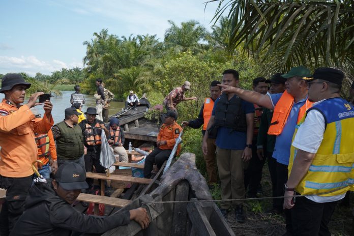 Bupati dengan rombongan selanjutnya melaksanakan peninjauan ke lokasi tanggul yang jebol menggunakan perahu sampan, situasi tanggul yang jebol mengakibatkan melimpahnya air ke lahan perkebunan dan pemukiman warga.