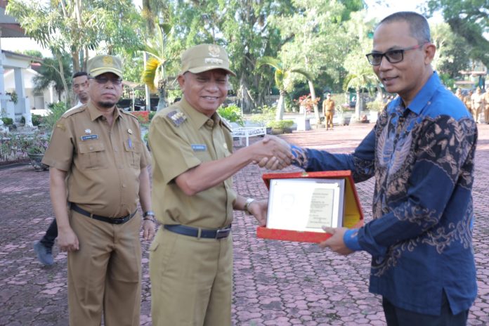 Sebelum memulai pidatonya, Bupati memberikan cinderamata kepada Junaidi Marianto, SE Kabag Perencanaan dan Keuangan Setdakab Asahan yang telah pensiun.