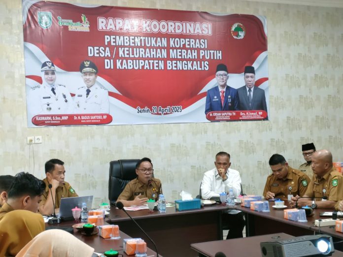 Bengkalis – Bupati Bengkalis Kasmarni diwakili Sekretaris Daerah Kabupaten Bengkalis dr. Ersan Saputra membuka rapat koordinasi pembentukan Koperasi Desa/Kelurahan Merah Putih di Kabupaten Bengkalis, Senin, 21 April 2025 di ruang rapat kantor Dinas Koperasi dan UKM Jalan Pertanian Bengkalis.