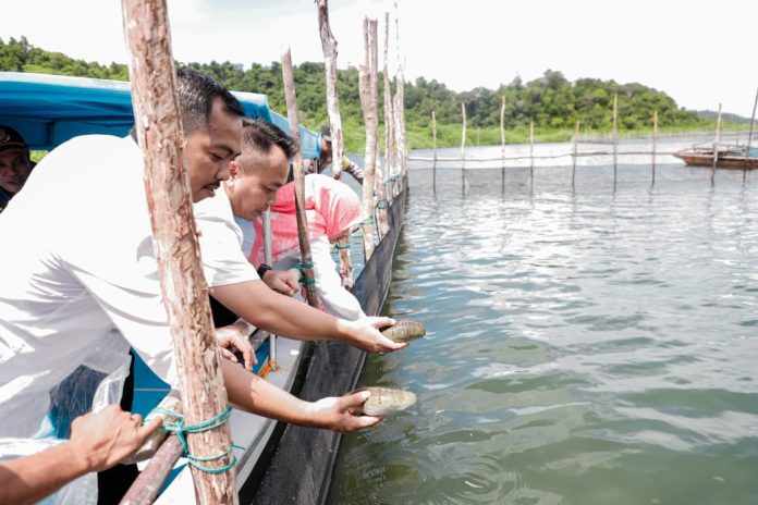 Bupati Lingga bersama Kepala Dinas Kelautan dan Perikanan (DKP) Kabupaten Lingga tabur teripang di tambak salah satu kelompok pembudidaya Program ini diharapkan bisa memberikan pendapatan tambahan bagi nelayan yang sebagian besar masih bekerja sebagai nelayan tangkap.