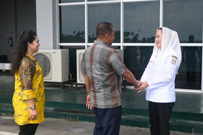 FOTO : Bupati Natuna Cen Sui Lan menyambut kedatangan Komandan Lanud Raden Sadjad (RSA) Natuna, Marsekal Pertama TNI Onesmus Gede Rai Aryadi, S.E., M.M., M.Han., bersama Ketua PIA Ardhya Garini Cabang 17/D.I Lanud RSA, Ny. Marni Onesmus Pasaribu, tiba di Bandara Raden Sadjad, Ranai Natuna, Provinsi Kepri, Rabu (8/10/2025).