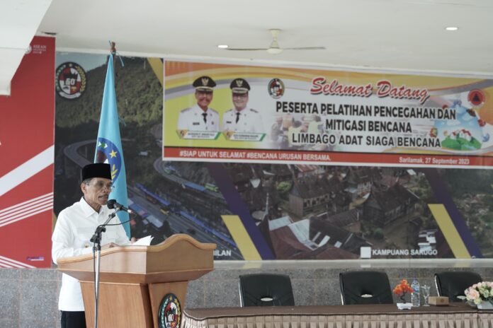 “Dimulai dari tingkat nagari,” kata Bupati Lima Puluh Kota Safaruddin saat membuka kegiatan pelatihan pencegahan dan mitigasi bencana tahun 2023 bagi 70 pengurus Kerapatan Adat Nagari/Limbago Adat Nagari/niniak mamak dari 42 nagari se-Lima Puluh Kota, Rabu, (27/9/2023).