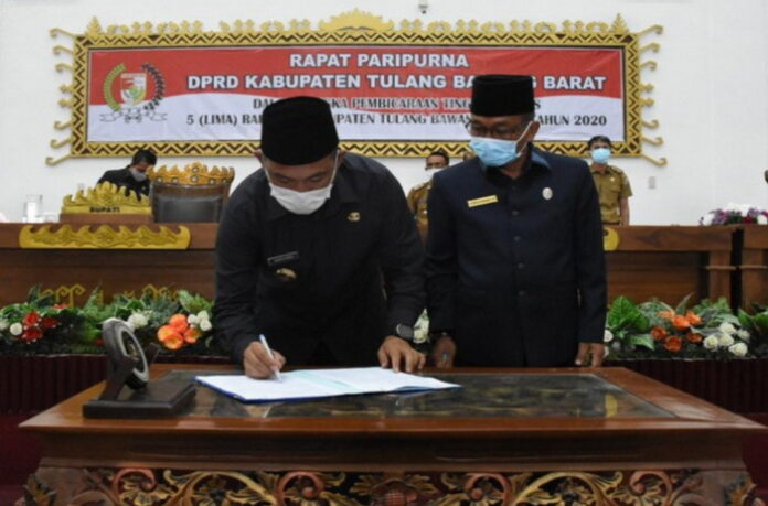Bursakota.co.id, Tulang Bawang – Bupati Tubaba Umar Ahmad dan ketua DPRD kabupaten Tulang bawang barat Ponco Nugroho menandatangani lima Raperda pada rapat paripurna DPRD di gedung dewan setempat, Senin, 7 Desember 2020.