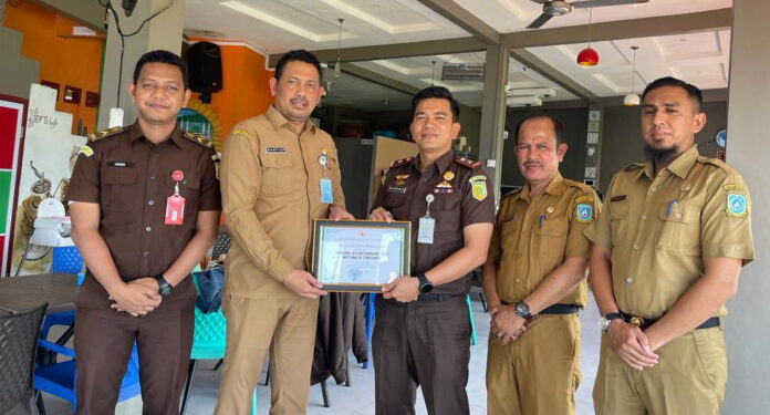 Ket Foto : Sekretaris Daerah kabupaten Kepulauan Anambas Sahtiar, S.H, M.M memberikan penghargaan dan ucapan terima kasih kepada Cabang Kejaksaan Negeri (Cabjari) Natuna di Tarempa Senin (16/01/2023).