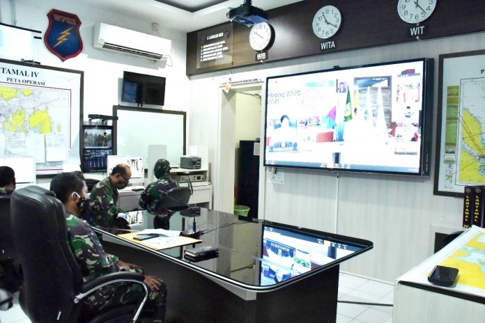 Bursakota, Tanjungpinang – Komandan Pangkalan Utama TNI Angkatan Laut (Danlantamal) IV Laksamana Pertama TNI Arsyad Abdullah, S.E., M.A.P., mengikuti acara Musyawarah Perencanaan Pembangunan (Musrenbang) Provinsi Kepulauan Riau Tahun 2020 melalui Video conference (Vicon) yang berlangsung di Ruang Kendali Operasi (RKU) Markas Komando (Mako) Lantamal IV Jl. Yos Sudarso No.1 Batu Hitam Tanjungpinang, Kepri, Rabu (29/4/2020).