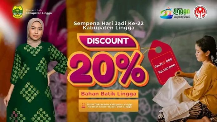 Lingga – Dalam rangka memperingati Hari Jadi ke-22 Kabupaten Lingga, Dewan Kerajinan Nasional Daerah (Dekranasda) Lingga memberikan diskon spesial 20 persen untuk seluruh Produk Batik Lingga.