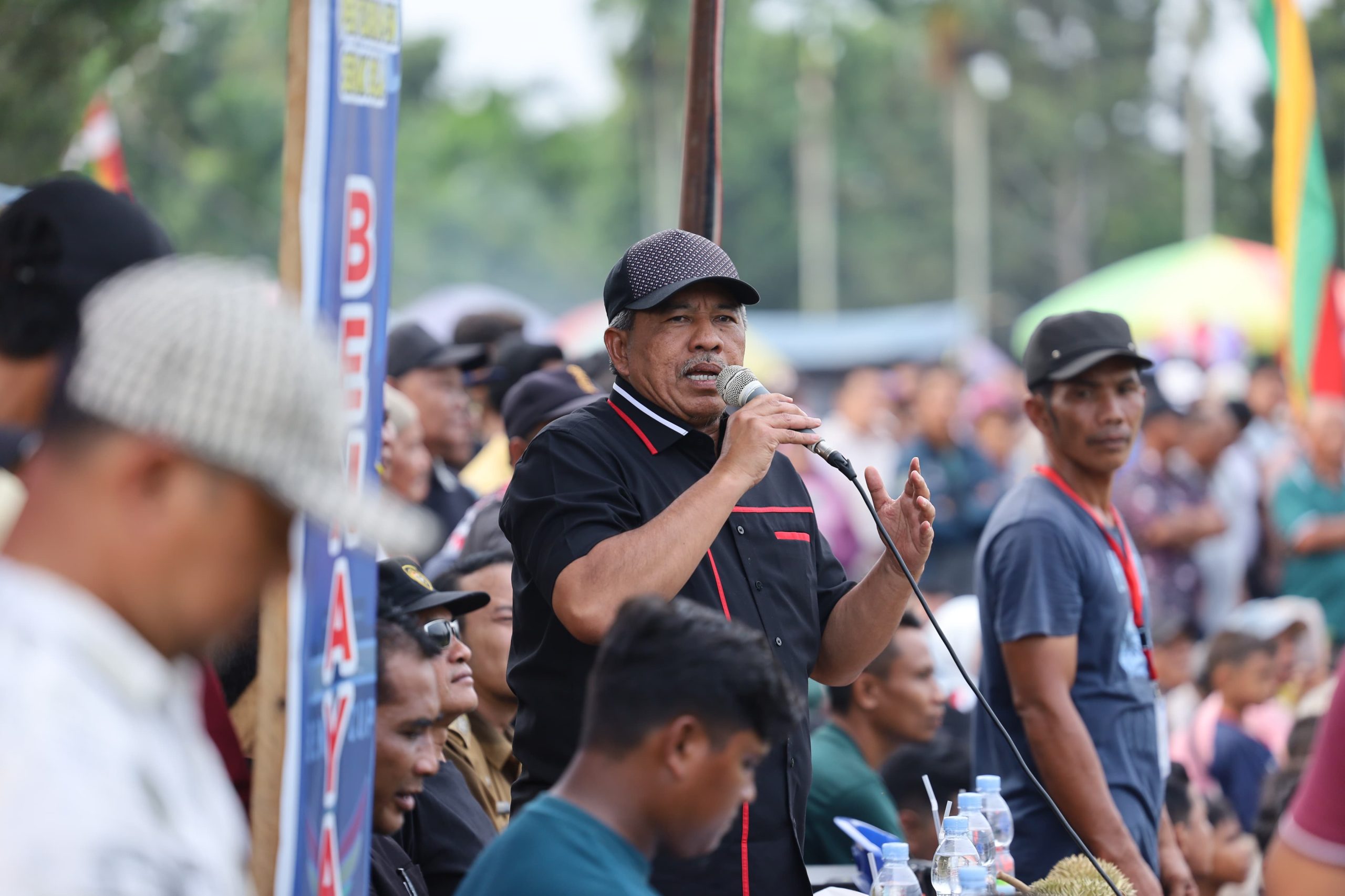 Ket Foto : Bupati Siak Alfedri menyaksikan pertandingan sepak bola di Lapangan Bola Kampung Benayah, Kecamatan Pusako, Senin (2/9/2024).