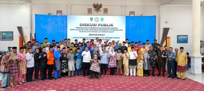 Natuna — Badan Perjuangan Pembentukan Provinsi Khusus Kepulauan Natuna Anambas (BP3K2NA) menggelar Diskusi Publik dengan tema “Percepatan Pembentukan Provinsi Khusus Kepulauan Natuna-Anambas dalam Perspektif Integrasi dan Kedaulatan Bangsa di Perbatasan.” Kegiatan ini berlangsung di Gedung Sri Serindit, Jalan Yos Sudarso, Kecamatan Bunguran Timur, Kabupaten Natuna. Rabu (23/04/2025).