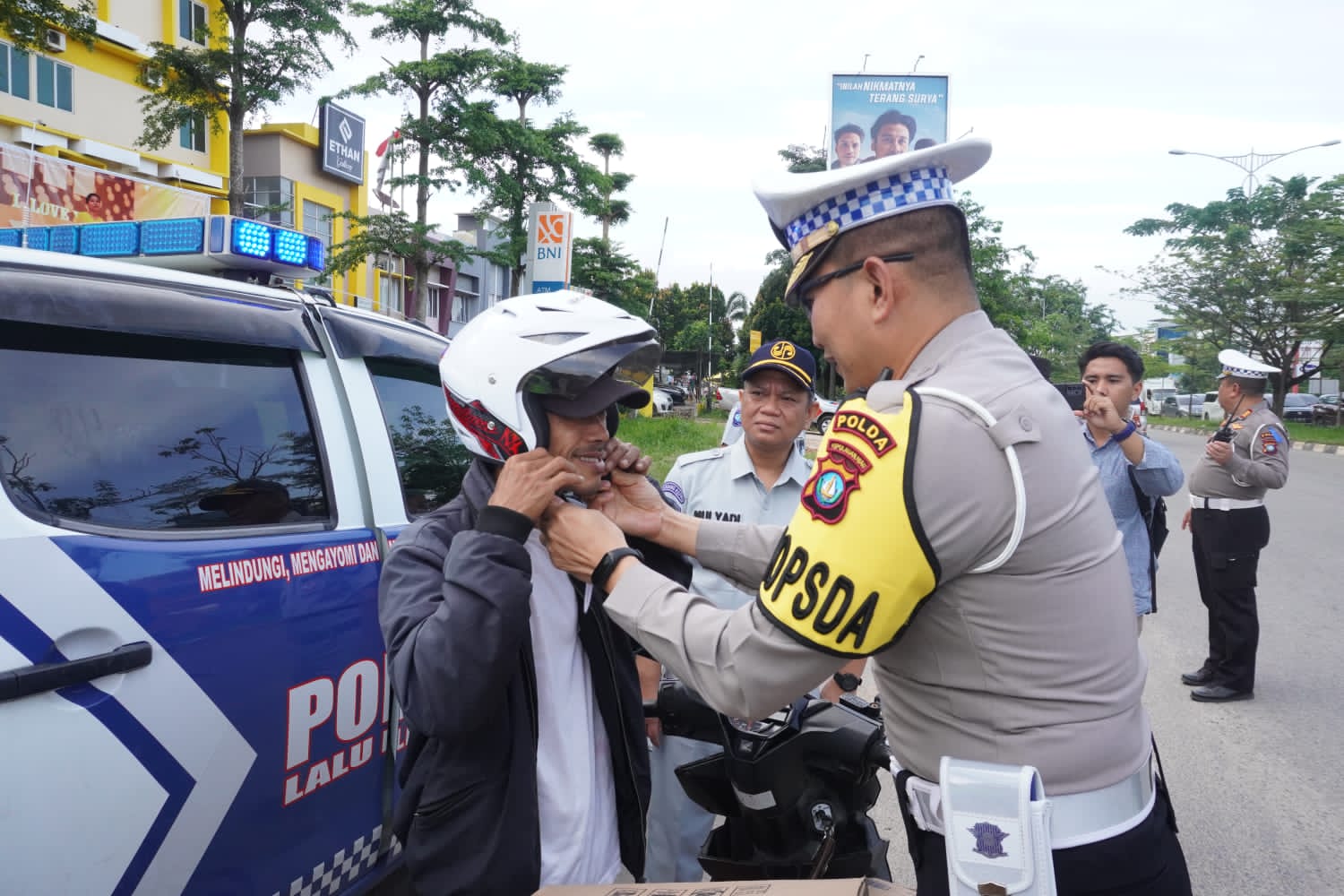 Dirlantas Polda Kepri Kombes Pol Tri Yulianto, S.I.K., M.Si. Menjelaskan hari ini kita akan melakukan kegiatan pre emtif dengan cara mengedukasi dan memberikan bimbingan kepada masyarakat pengguna jalan supaya tertib dan memiliki inisiatif untuk menggunakan helm sesuai ketentuan tapi karena dia ada keterbatasan, helm yang sekiranya sudah kurang layak kita ganti dengan helm yang baru.