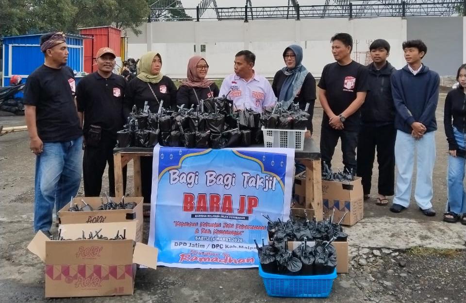 Malang – Dewan Pimpinan Daerah (DPD) Barisan Relawan Jalan Perubahan (Bara JP) Jawa Timur bersama DPC Bara JP Kabupaten Malang menggelar kegiatan sosial dengan membagikan 1.000 paket takjil kepada para pengguna jalan, Sabtu (14/3/2026).