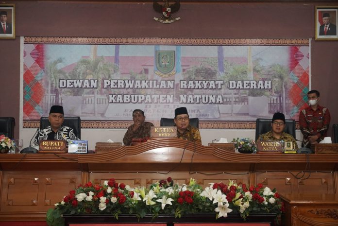 Natuna – Dewan Perwakilan Rakyat Daerah (DPRD) Kabupaten Natuna menggelar rapat paripurna penyampaian pidato Bupati terhadap RAPBD Kabupaten Natuna tahun anggaran 2022 dan 2023 di Gedung Paripurna DPRD Natuna, Jum’at 16 September 2022.