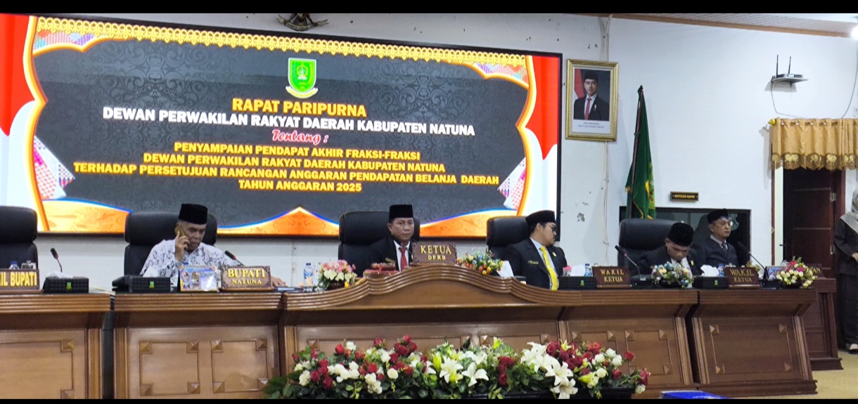 Setelah menyampaikan pendapat akhir seluruh fraksi Menyepakati RAPBD Kabupaten Natuna Tahun Anggaran 2025 sebesar Rp1.334 triliun atau naik dari tahun sebelumnya sebesar Rp 1.268 triliun. (Bk/Dika)