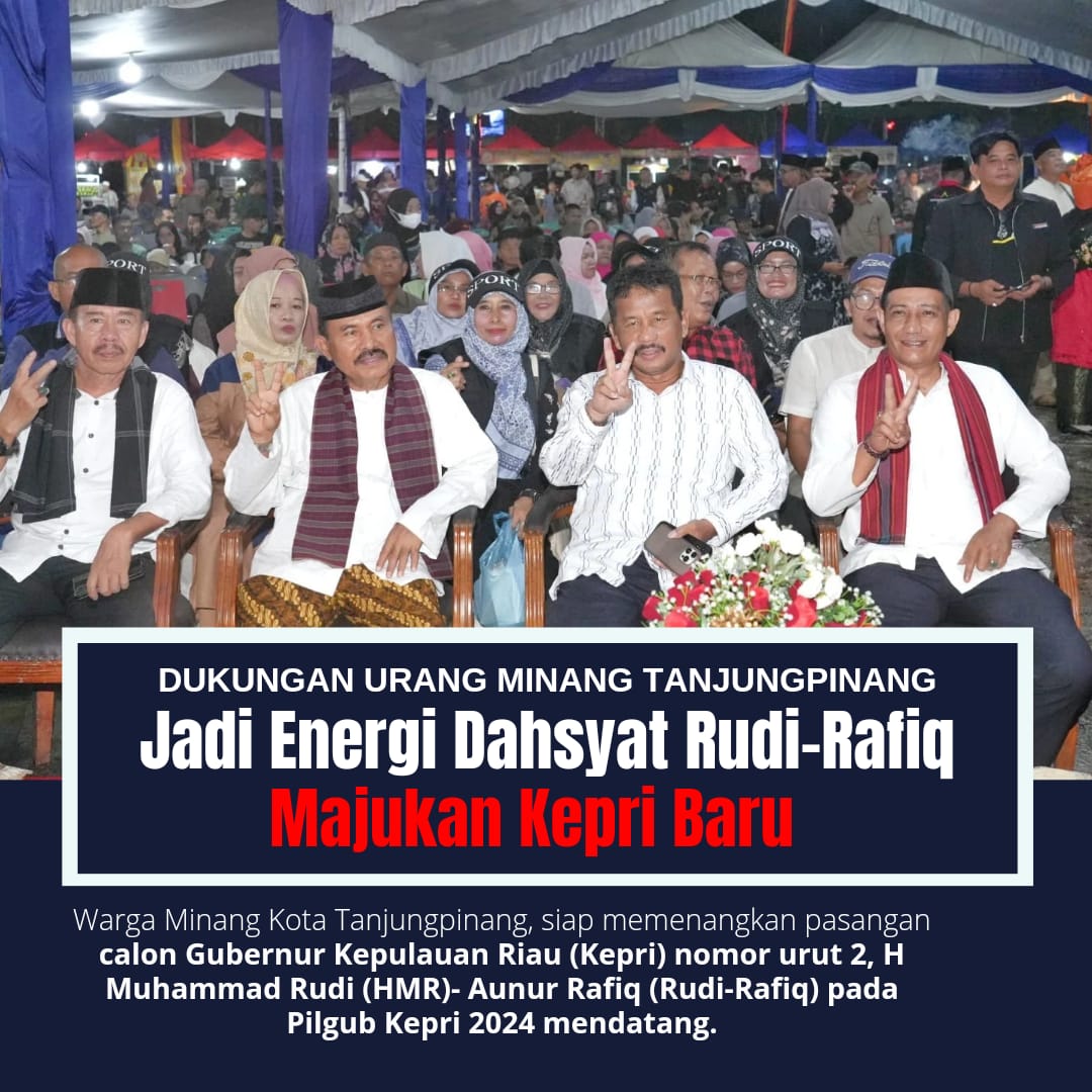 TANJUNGPINANG – Warga Minang Kota Tanjungpinang, siap memenangkan pasangan calon Gubernur Kepulauan Riau (Kepri) nomor urut 2, H Muhammad Rudi (HMR)- Aunur Rafiq (Rudi-Rafiq) pada Pilgub Kepri 2024 mendatang.