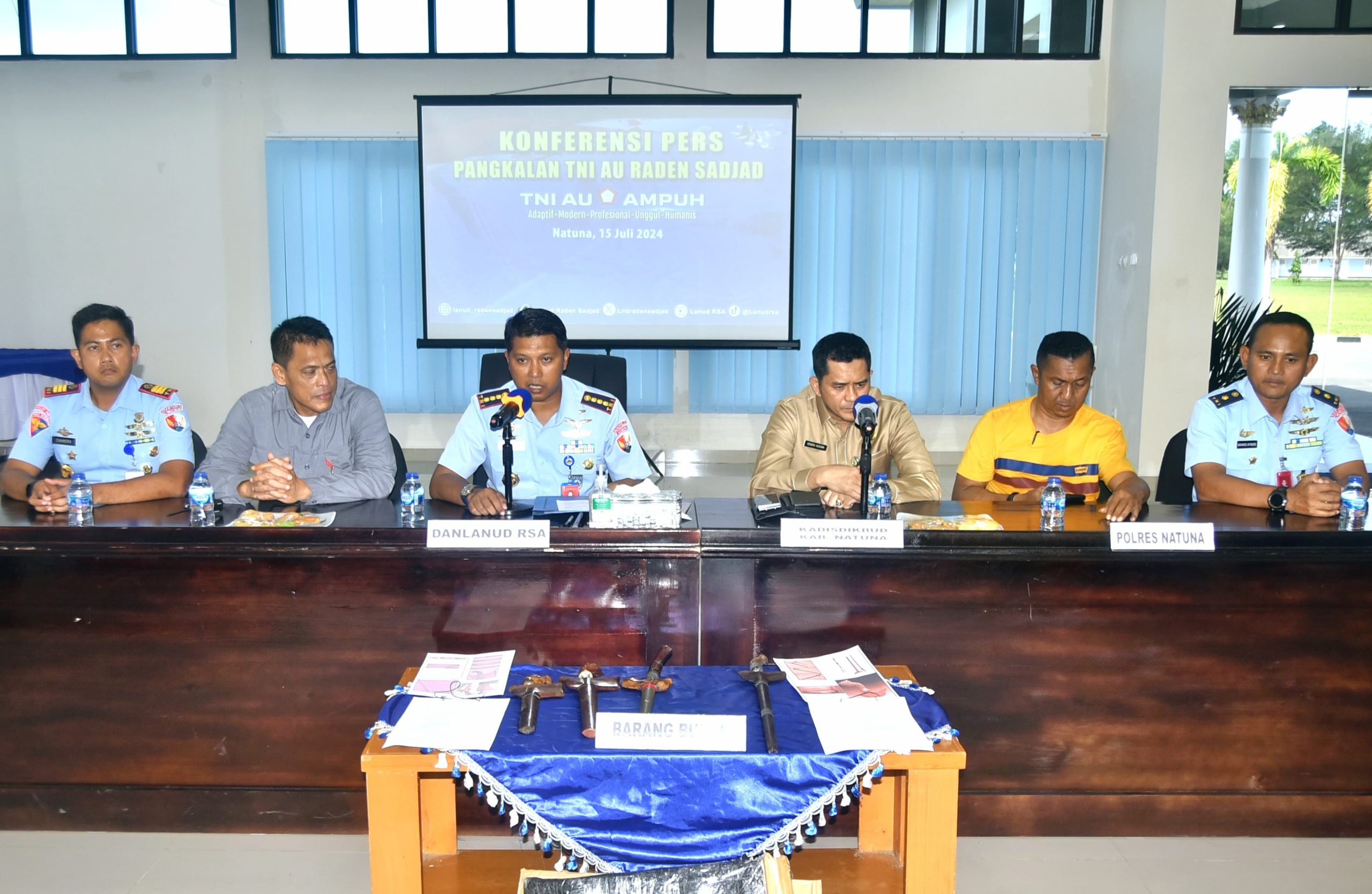 Dalam konferensi pers tersebut, hadir Kepala Dinas Pendidikan dan Kebudayaan Kabupaten Natuna, Hendra Kusuma, S.H., M.Si., Kadisops Lanud RSA Mayor Nav Nanang Afandik, Dansatpomau Lanud RSA Kapten Pom Chandra P. Haryanto H., S.T.Han., Kaintel Lanud RSA Kapten Sus Bowo Raharjo, dan Kanit II Sat Reskrim Polres Natuna Aiptu Teddy Syahputra.