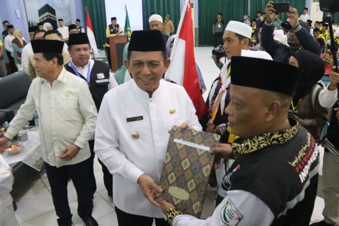 Gubernur Ansar dalam sambutannya mengajak semua jamaah calon haji, untuk terus bersyukur, karena telah terpilih sebagai tamu Allah SWT yang akan melaksanakan ibadah rukun Islam kelima tahun ini.