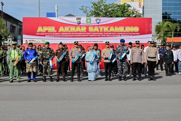 Bengkalis – Bupati Bengkalis Kasmarni menghadiri Apel Akbar Satuan Keamanan Lingkungan (Satkamling) Tahun 2025 yang digelar oleh Polres Bengkalis, bertampat di Halaman Kantor Camat Mandau, Jumat (12/9/2025).