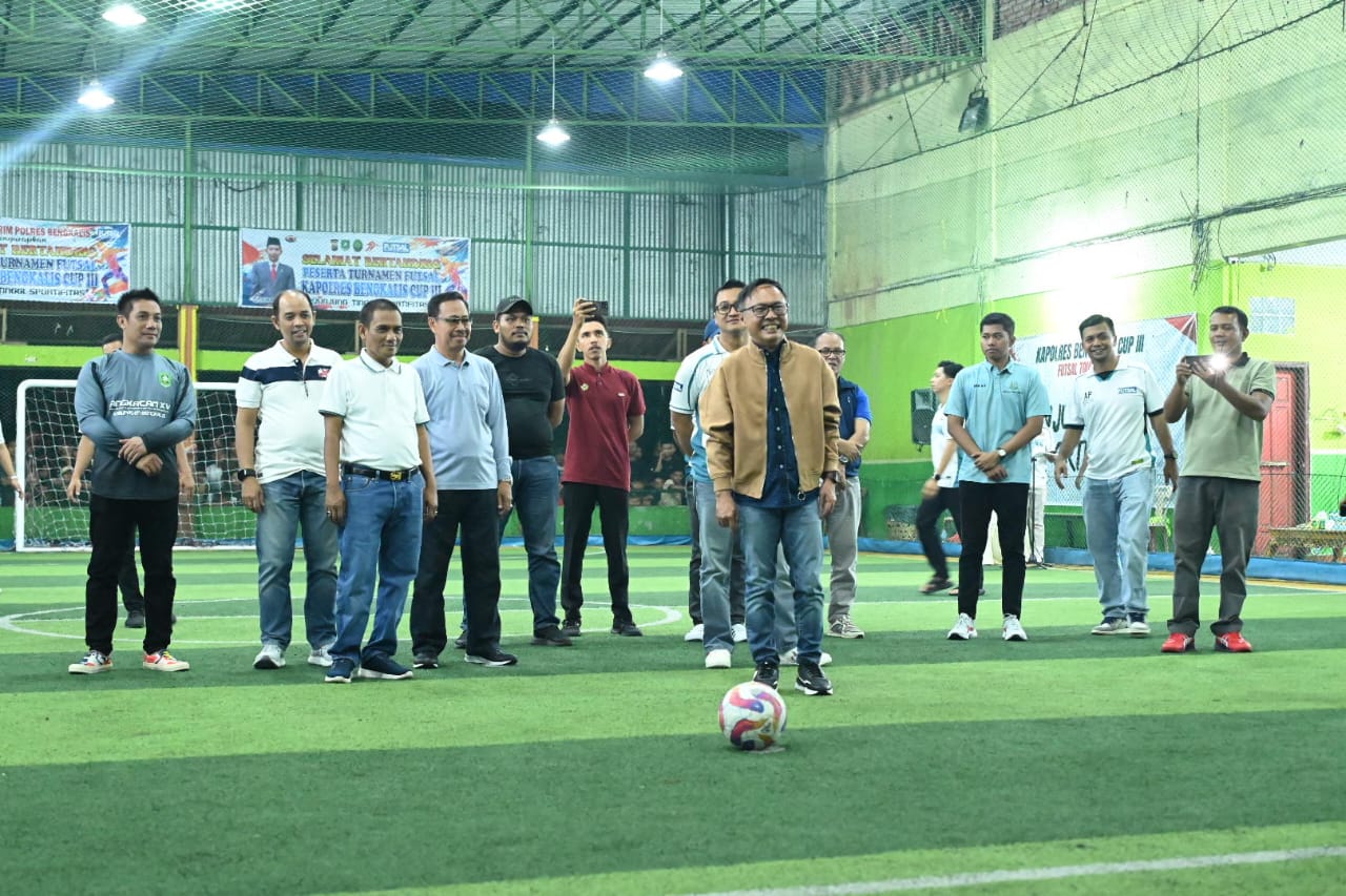 Bengkalis – Sekretaris Daerah Kabupaten Bengkalis, dr. Ersan Saputra TH, hadiri pembukaan Open Turnamen Futsal Kapolres Bengkalis Cup III Kategori Umum Tahun 2025 sempena Hari Bhayangkara ke-79, Senin (17/6/2025), bertempat di Lapangan Futsal Keybon, Desa Kelapapati Tengah, Kecamatan Bengkalis.