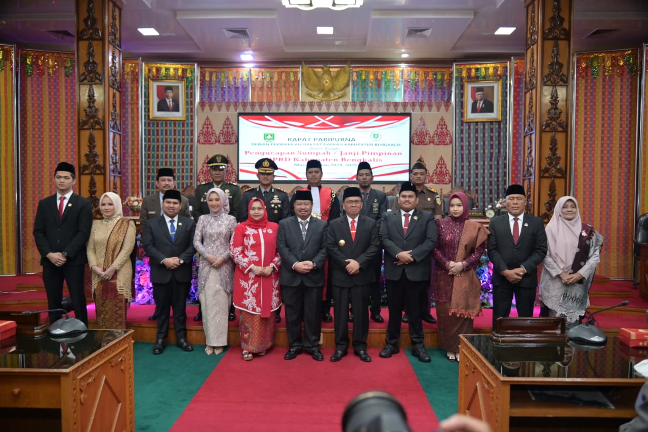 “Atas nama pribadi dan Pemerintah Kabupaten Bengkalis kami mengucapkan selamat kepada Bapak Septian Nugraha dari fraksi PDI-P sebagai Ketua DPRD Kabupaten Bengkalis, Bapak M Arsya Fadhillah dari fraksi Partai Nasdem sebagai Wakil Ketua I, Bapak Hendrik Prinanda Pangaribuan dari Fraksi Gerindra sebagai Wakil Ketua II, dan Bapak H. Misno dari Fraksi PKS sebagai Wakil Ketua III, yang baru saja di ambil sumpah janjinya sebagai pimpinan DPRD Kabupaten Bengkalis masa jabatan 2024-2029,” ucap Tavip.